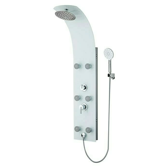 Das Duschpaneel Sylt 2.0 von Camargue überzeugt durch ihr edles Glas-Design und ist die perfekte Lösung für ein luxuriöses Duscherlebnis mit Kopf- und Handbrause. Mit diesem Duschsystem können Sie vollkommen entspannt in den Tag starten. Das komfortable Komplettset besteht aus einer 5-fach verstellbaren Handbrause, 6 Massagedüsen sowie einer großen, runden Kopfbrause. Die Bedienung des integrierten Einhebelmischers, für die Einstellung von Wassermenge- und temperatur gestaltet sich so besonders leicht und komfortabel. Sehr praktisch sind die Antikalk-Noppen, die Kalkablagerungen an den Strahlöffnungen der Brausen dauerhaft verhindern. Die Anbringung des Duschpaneels kann per Bohren mit dem im Lieferumfang enthaltenen Montagematerial erfolgen.