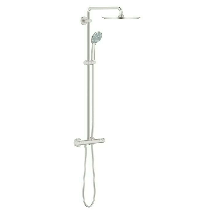 Mit dem Euphoria Duschsystem von Grohe sorgen Sie ohne aufwändige Umbauarbeiten ganz schnell für mehr Entspannung im Bad. Die große Wellnesskopfbrause und die extravagante und praktische 3-Strahl-Handbrause schaffen ein angenehmes Duscherlebnis. Die DreamSpray®-Technologie verteilt das Wasser gleichmäßig auf jede einzelne Düse – ganz gleich, welche der unterschiedlichen Strahlarten Sie wählen. Außerdem besitzen die Brausen eine Speed-Clean-Funktion. Lästige Kalkablagerungen werden so durch die integrierten Anti-Kalknoppen effektiv verhindert und durch Reiben der Noppen gelöst. Die Massagehandbrause ist individuell höhenverstellbar mittels Gleitelement. Das Aufputz-Thermostat mit Aquadimmerfunktion ermöglicht den Wechsel zwischen Kopfbrause und Handbrause. Der flexible Silverflex-Brauseschlauch mit Twistfree verhindert effektiv das Verdrehen des Brauseschlauches. Die StarLight®-Oberfläche ist besonders kratzfest und farbecht und mit EcoJoy® sparen Sie am Wasser, aber nicht am Genuss.