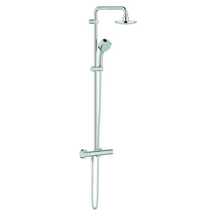 Mit dem Tempesta Duschsystem von Grohe sorgen Sie ohne aufwändige Umbauarbeiten ganz schnell für mehr Entspannung im Bad. Das Überkopfbrause-Set überzeugt mit seinem edlen Design und bietet als komfortable Komplettlösung alles Notwendige für Ihre Dusche. Das Duschsystem ist mit einer Wellnesskopfbrause sowie einer 2-Strahl Handbrause ausgestattet. Die DreamSpray® Technologie verteilt das Wasser gleichmäßig auf jede einzelne Düse – Ganz gleich, welche der unterschiedlichen Strahlarten Sie wählen. Außerdem besitzen die Brausen eine Speed-Clean Funktion – Lästige Kalkablagerungen werden so durch die integrierten Anti-Kalknoppen effektiv verhindert und durch Reiben der Noppen gelöst. Die Massagehandbrause ist individuell höhenverstellbar mittels Gleitelement. Das Thermostat mit Aquadimmerfunktion ermöglicht den Wechsel zwischen Kopf- und Handbrause. Der flexible Silverflex-Brauseschlauch mit Twistfree verhindert effektiv das Verdrehen des Brauseschlauches.
