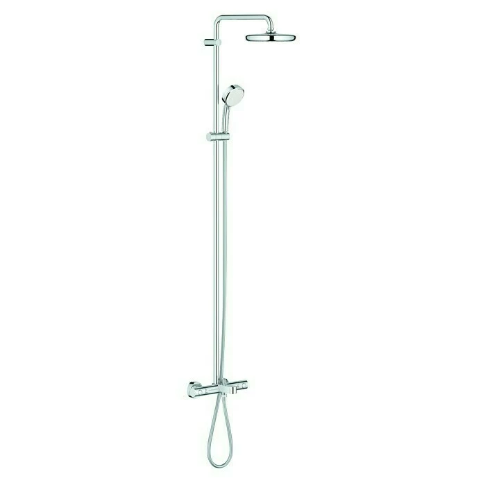 Das Tempesta Cosmopolitan Duschsystem 210 von Grohe mit Thermostat-Wannenbatterie ist eine Komplettlösung mit integrierter Grohe TurboStat Kartusche. Sie ist höchst widerstandfähig und langlebig; die Bedienung mit einer Hand für die Einstellung von Wassermenge- und Temperatur gestaltet sich so besonders leicht und komfortabel. Die Wellnesskopfbrause und die extravagante und praktische 2-Strahl Handbrause schaffen ein angenehmes Duscherlebnis. Die DreamSpray® Technologie verteilt das Wasser gleichmäßig auf jede einzelne Düse – ganz gleich, welche der unterschiedlichen Strahlarten Sie wählen. Außerdem besitzen die Brausen eine Speed-Clean Funktion, die durch ihre integrierten Anti-Kalknoppen lästige Kalkablagerungen effektiv verhindern. Der Umsteller ermöglicht den Wechsel zwischen Kopf-und Handbrause. Die Handbrause ist individuell höhenverstellbar mittels Gleitelement. Der flexible Brauseschlauch mit Twistfree verhindert effektiv das Verdrehen des Brauseschlauches. Die StarLight® Chromoberfläche liefert langlebigen Hochglanz und erweist sich zudem als besonders widerstandsfähig gegen Schmutz und Kratzer.
