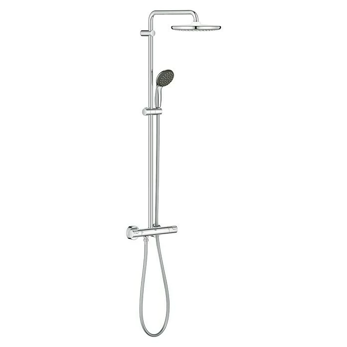 Das Duschsystem Vitalio Start von Grohe ist mit Kopfbrause, Handbrause und komfortabler Thermostatarmatur ein modernes Komplettsystem aus einem Guss. Die belebende Kopfbrause mit 25 cm Durchmesser lässt sich dank des schwenkbaren Duscharms zu beiden Seiten bewegen und mittels Kugelgelenk um 10 Grad in jede Richtung kippen. Sowohl Kopf- als auch Handbrause sind mit EcoJoy-Wasserspartechnik ausgestattet, was den Wasserverbrauch um bis zu 50 % reduziert – ohne jeglichen Komfortverlust. Dank der SpeedClean Antikalk-Noppen lassen sich Kalkablagerungen jederzeit durch simples Reiben mühelos entfernen. DreamSpray sorgt im Inneren beider Brausen für eine gleichmäßige Wasserverteilung auf jede einzelne Düse. Die höhenverstellbare Handbrause mit zwei wählbaren Strahlarten ist mit einem Silikonring ausgerüstet, der vor Beschädigungen beim Herunterfallen schützt und dank eines Verdrehschutzes bleibt der Brauseschlauch stets in einer ergonomisch günstigen Position. Die StarLight Chromoberfläche liefert langlebigen Hochglanz und erweist sich zudem als besonders widerstandsfähig gegen Schmutz und Kratzer.