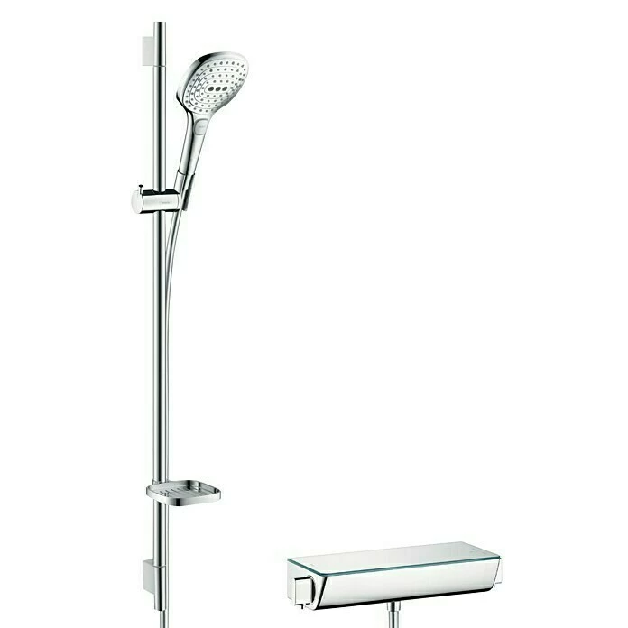 Das Brause-Set von Hansgrohe enthält eine Handbrause der Reihe Raindance Select E 120 sowie ein Ecostat Comfort-Thermostat, einen Brauseschlauch, eine Brausestange, eine Seifenschale und Wandhalter aus Kunststoff. Es überzeugt durch ein modernes und geradliniges Gesamtbild mit harmonisch aufeinander abgestimmten Elementen. Dank der CoolContact-Bauweise bleibt das Thermostat auch bei Heißwassernutzung immer angenehm kühl und erhöht so die Sicherheit für Sie und Ihre Kinder. Mit seiner großzügigen Ablagefläche aus Sicherheitsglas bietet das Thermostat darüber hinaus reichlich Platz für Dusch-Utensilien. Die innovative Select-Technologie ermöglicht ein bequemes Umschalten zwischen drei verschiedenen Strahlarten auf Knopfdruck. AirPower senkt den Wasserbedarf, indem das Wasser mit Luft vermischt wird. So fühlt sich der Strahl zudem weicher, leichter und fülliger an. Mit der Quick-Clean Funktion verschwinden lästige Kalkablagerungen im Handumdrehen: Rückstände können von den flexiblen Anti-Kalk-Noppen einfach abgerubbelt werden. Verbrühungen können dank der integrierten Heißwassersperre effektiv verhindert werden. Der höhenverstellbare Schieber ist schwenkbar sowie um 90° im Winkel verstellbar. Darüber hinaus wird mit dem an der Handbrause integrierten Drehwirbel ein Verdrehen des Brauseschlauches verhindert, was für uneingeschränktes Duschvergnügen sorgt. Bei Montage auf einen bestehenden G ¾-Anschluss wird der Adapter 02026000 benötigt.