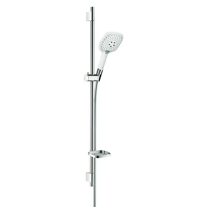 Die Brausegarnitur von Hansgrohe enthält eine Handbrause der Reihe Raindance Select E 150 sowie einen Brauseschlauch, eine Brausestange, eine Seifenschale und Wandhalter aus Kunststoff. Sie begeistert mit modernem, geradlinigem Design und harmonisch aufeinander abgestimmten Elementen in Chrom und Weiß. Die innovative Select-Technologie ermöglicht ein bequemes Umschalten zwischen drei verschiedenen Strahlarten auf Knopfdruck. AirPower senkt den Wasserbedarf, indem das Wasser mit Luft vermischt wird. So fühlt sich der Strahl zudem weicher, leichter und fülliger an. Dank der Quick-Clean Funktion verschwinden lästige Kalkablagerungen im Handumdrehen: Rückstände können von den flexiblen Anti-Kalk-Noppen einfach abgerubbelt werden. Der höhenverstellbare Schieber ist schwenkbar sowie um 90° im Winkel verstellbar. Mit dem an der Handbrause integrierten Drehwirbel wird ein Verdrehen des Brauseschlauches verhindert, was für uneingeschränktes Duschvergnügen sorgt.