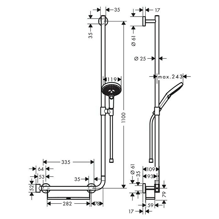 Die Brausegarnitur von Hansgrohe enthält eine Handbrause der Reihe Raindance Select S 120 sowie einen Brauseschlauch, eine Seifenschale und eine 110 cm lange Wandstange mit linksseitiger Haltegriff-Funktion. Das Konzept überzeugt dabei mit seiner Kombination aus sehr solider Bauweise und gleichzeitig überaus elegantem, geradlinigem Design. Die innovative Select-Technologie ermöglicht ein bequemes Umschalten zwischen drei verschiedenen Strahlarten auf Knopfdruck. AirPower senkt den Wasserbedarf, indem das Wasser mit Luft vermischt wird. So fühlt sich der Strahl zudem weicher, leichter und fülliger an. Dank der Quick-Clean Funktion verschwinden lästige Kalkablagerungen im Handumdrehen: Rückstände können von den flexiblen Anti-Kalk-Noppen einfach abgerubbelt werden. Der höhenverstellbare Schieber ist schwenkbar sowie um 90° im Winkel verstellbar. Mit dem an der Handbrause integrierten Drehwirbel wird ein Verdrehen des Brauseschlauches verhindert, was für uneingeschränktes Duschvergnügen sorgt. Die Sicherheit der Brausegarnitur ist durch TÜV SÜD geprüft.