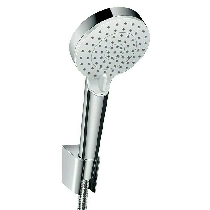 Das Brause-Set von Hansgrohe enthält eine Handbrause der Reihe Crometta Vario sowie einen Brauseschlauch und einen Wandhalter aus Kunststoff. Über die drehbare Strahlscheibe können zwei verschiedene Strahlarten angewählt werden. Dank der Quick-Clean Funktion verschwinden lästige Kalkablagerungen im Handumdrehen: Rückstände können von den flexiblen Anti-Kalk-Noppen einfach abgerubbelt werden. Mit dem an der Handbrause integrierten Drehwirbel wird ein Verdrehen des Brauseschlauches verhindert, was für uneingeschränktes Duschvergnügen sorgt.
