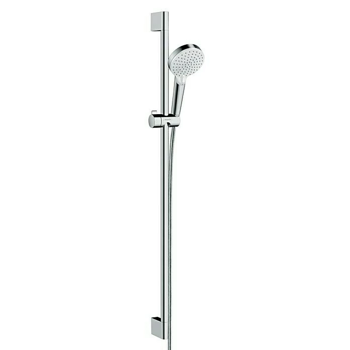 Die Brausegarnitur von Hansgrohe enthält eine Handbrause der Reihe Crometta Vario sowie einen Brauseschlauch, eine Brausestange und Wandhalter aus Kunststoff. Sie überzeugt durch ein sehr elegantes und modernes Gesamtbild mit harmonisch aufeinander abgestimmten Elementen in Chrom und Weiß. Über die drehbare Strahlscheibe können zwei verschiedene Strahlarten angewählt werden. Dank der Quick-Clean Funktion verschwinden lästige Kalkablagerungen im Handumdrehen: Rückstände können von den flexiblen Anti-Kalk-Noppen einfach abgerubbelt werden. Der höhenverstellbare Schieber ist um 45° im Winkel verstellbar. Mit dem an der Handbrause integrierten Drehwirbel wird ein Verdrehen des Brauseschlauches verhindert, was für uneingeschränktes Duschvergnügen sorgt.