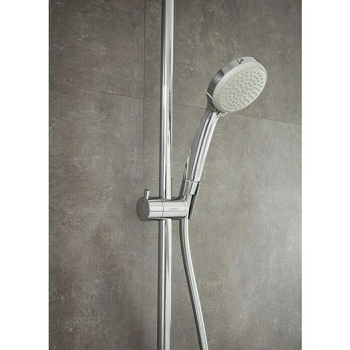 Das Überkopfbrause-Set Crometta E 240 von Hansgrohe sorgt für mehr Spaß, Wohbefinden und Komfort in der Dusche. Das Set besteht aus einer Thermostatarmatur, einer Brausestange, einer Kopf- und Handbrause sowie einem Brauseschlauch. Die funktionale und beständige Thermostatarmatur verfügt über die neueste Technologie mit der sich Wasser und Temperatur besonders leicht und präzise einstellen lässt. Die bei 40 °C positionierte Sicherheitssperre schützt insbesondere Kinder davor, die Temperatur versehentlich zu heiß einzustellen. Die verchromte Handbrause liefert auf Wunsch zwei verschiedene Strahlarten. Die Strahlarten lassen sich über eine drehbare Strahlscheibe umstellen. Mit der Quick-Clean Funktion verschwinden Rückstände im Handumdrehen. Lästige Kalkablagerungen werden aufgrund der integrierten Anti-Kalknoppen effektiv verhindert und durch Reiben der Noppen gelöst. Alle Bestandteile des Sets sind mit ½“ Anschlüssen versehen und passen auf jeden handelsüblichen Anschluss. Das erforderliche Montagematerial ist bereits im Lieferumfang enthalten.