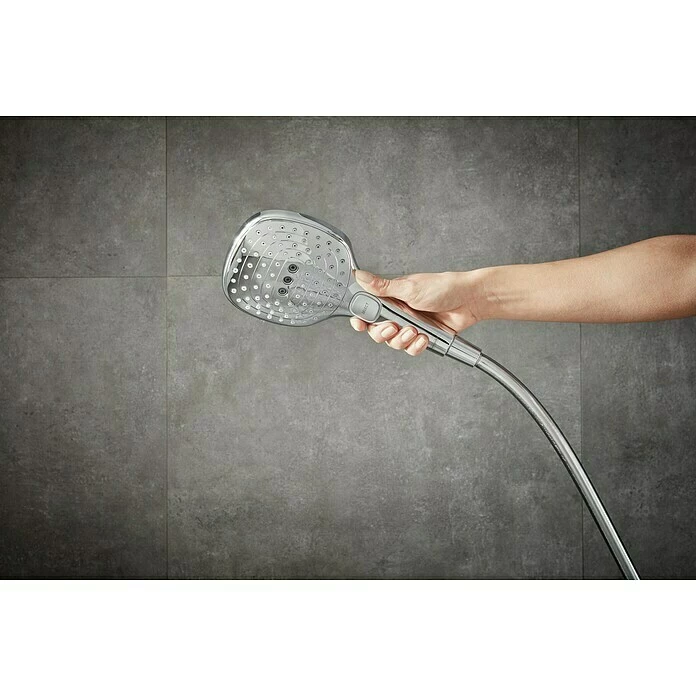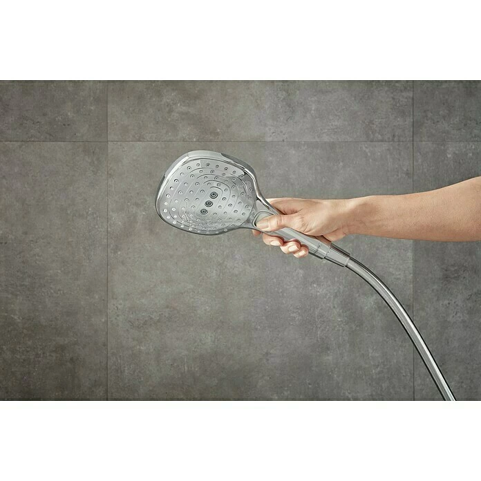 Die Handbrause Raindance Select E 120 von Hansgrohe begeistert mit modernem, elegantem Design und innovativen Funktionen. Die Select-Technologie ermöglicht ein bequemes Umschalten zwischen drei verschiedenen Strahlarten auf Knopfdruck. AirPower reichert das Wasser mit Luft an, was das Strahlbild fülliger und weicher macht und gleichzeitig den Verbrauch senkt. Dank der Quick-Clean Funktion verschwinden lästige Kalkablagerungen im Handumdrehen: Rückstände können von den flexiblen Anti-Kalk-Noppen einfach abgerubbelt werden. Die verchromte Oberfläche ist besonders pflegeleicht und langlebig. Mit ihrem genormten ½“-Anschluss ist die Handbrause passgenau montierbar.